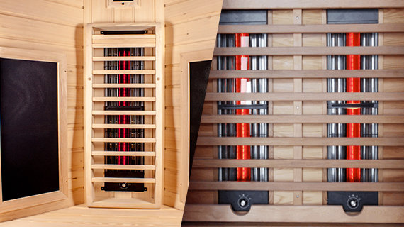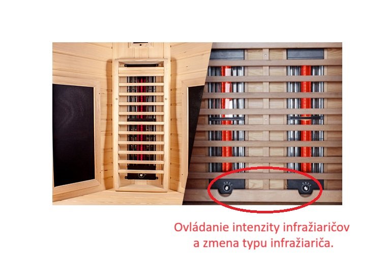 1 celospektrálne žiariče červeného svetla (lýtka) - Plnospektrálny žiarič červeného svetla. Celé spektrum lúčov je veľmi blízke prirodzeným slnečným lúčom. Celospektrálne reflektorové žiariče červeného svetla pozostávajú z 27 % krátkovlnného (IR-A), 58 % stredného (IR-B) a 15 % dlhovlnného infračerveného žiarenia (IR-C). Z dôvodu vyššej teploty jadra v radiátore na báze halogénovej technológie hovoríme o hlbokom teple. Hĺbka prieniku do pokožky tohto infražiariča je cca 4 až 5 mm. Menej vhodný pre ľudí s citlivou pokožkou alebo pre deti, ale optimálny selektívny účinok, napríklad pri problémoch s kĺbmi. Vysoká úroveň cieleného tepla znamená, že časti tela je možné ošetrovať veľmi cielene, aj keď polohu sedenia pred radiátorom treba často meniť. Nie je potrebný žiadny čas predhrievania, aplikácia začína ihneď po zapnutí.