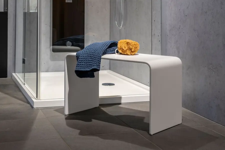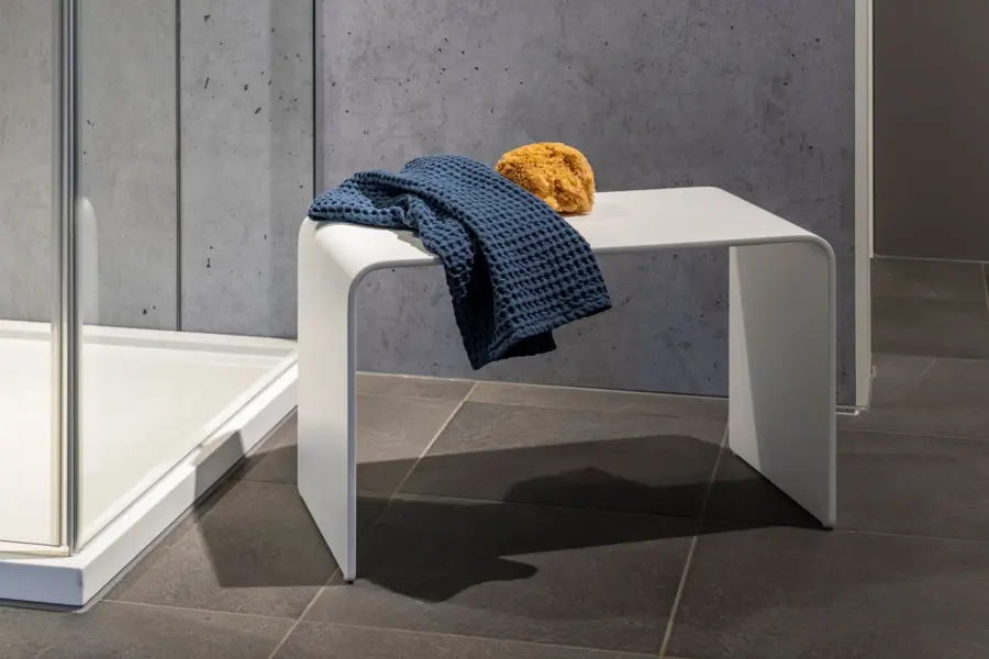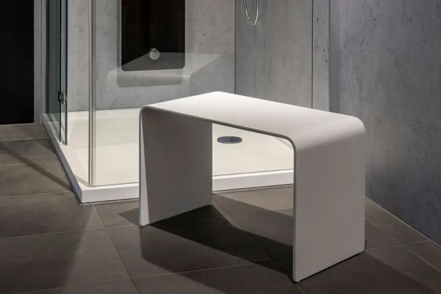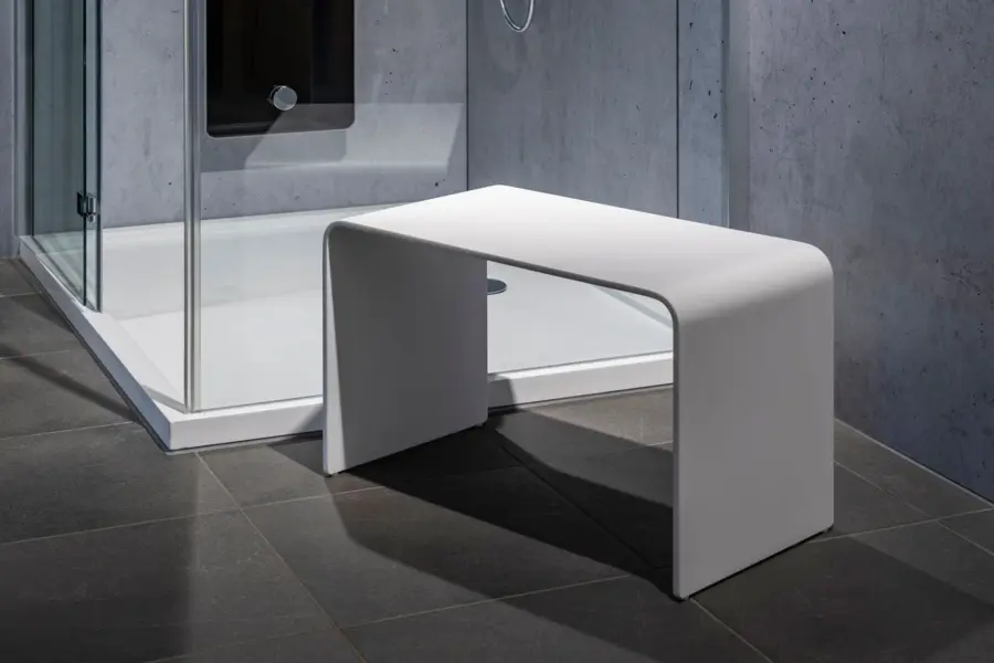 Lavička z kompozitného materiálu (minerálny odliatok) s rozmermi: 70 x 35 x 43 cm.