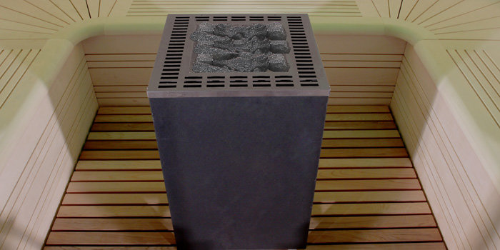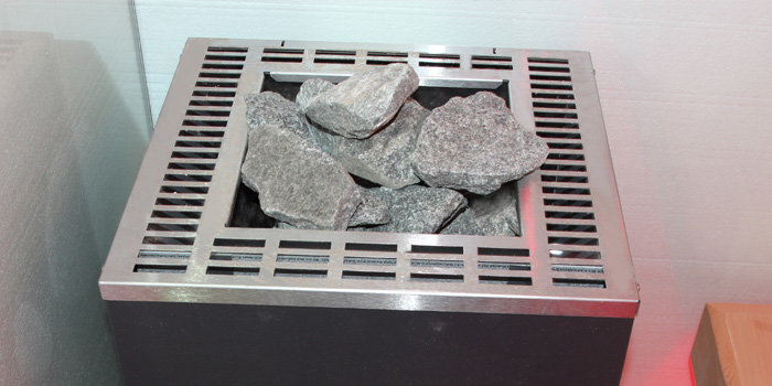 kameň v saune, drevený rošt - podlaha