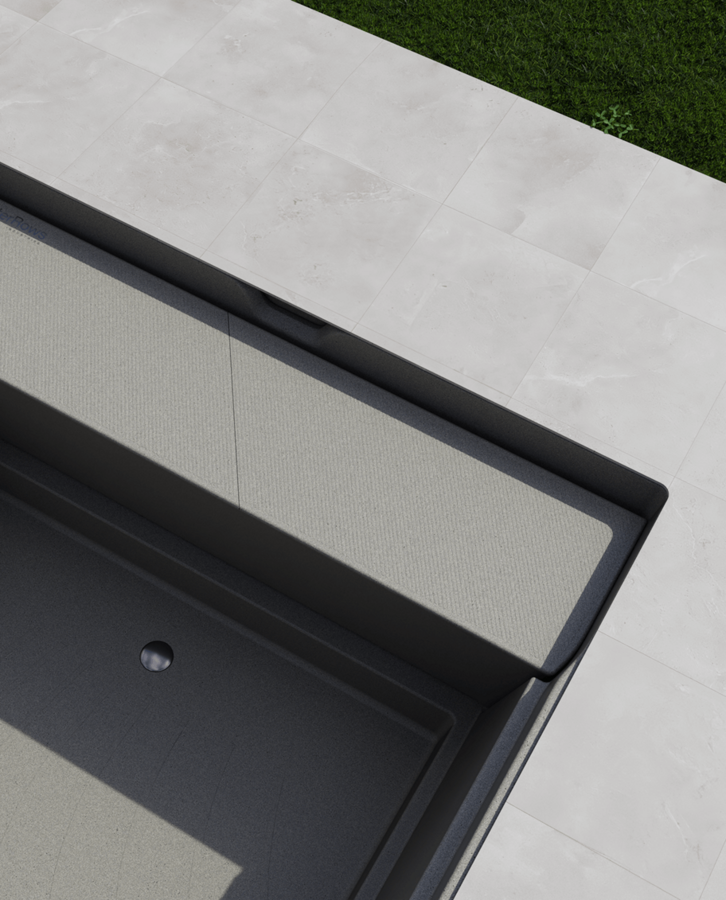 Dominantou je predĺžená lavica na opaľovanie, jemne podmyvovaná vodou, ktorá vytvára dokonalé miesto na relax, ochladenie a pohodové chvíle na slnku. Poskytuje ideálny priestor na ležanie, oddych či bezpečnú hru pre deti. Sunlounge pritom nie je len praktický doplnok – je to oáza pokoja, miesto pre slnečné rituály a malé každodenné úniky.